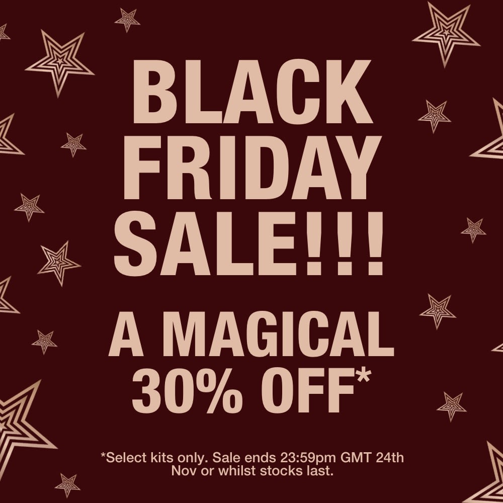• Maroon-coloured banner with text in gold that reads, 'Black Friday sale!! A magical 30% off'