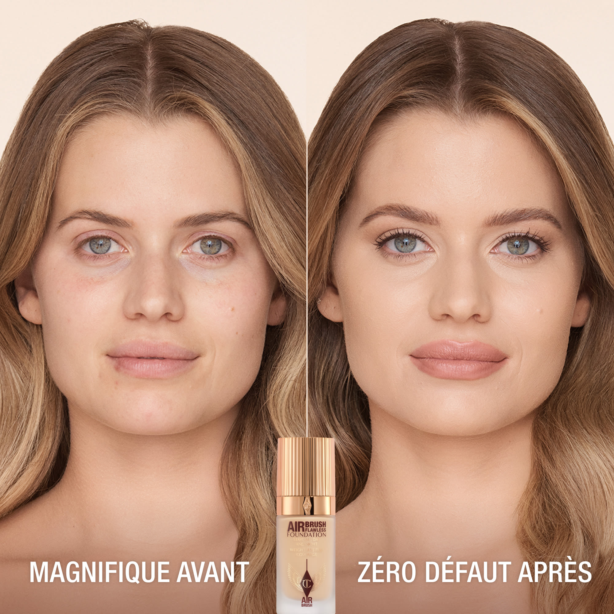 Pas étonnant que « WOW » soit la réaction unanime en essayant mon NOUVEAU Airbrush Flawless Foundation! Vous serez subjuguées après cette transformation maquillage ! RETOUCHÉE. ZÉRO DÉFAUT. PORES INVISIBLES. Votre peau comme vous ne l'avez jamais vue!