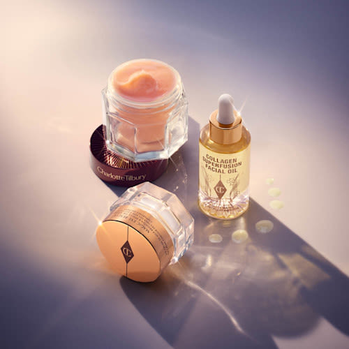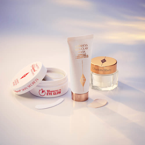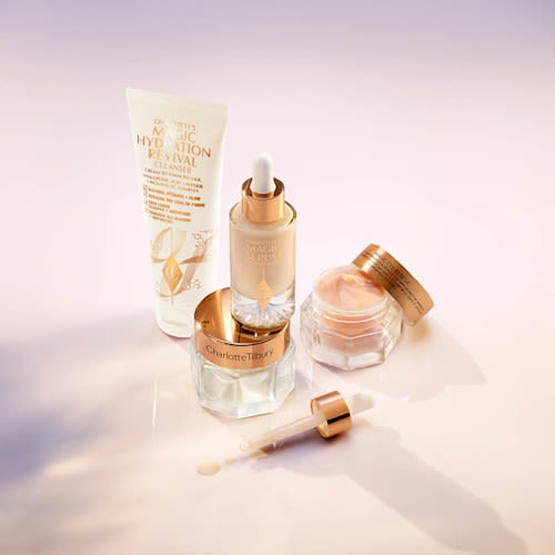 On cleansed skin, apply Charlotte’s Magic Serum Crystal Elixir to deliver a skin-conditioning surge of hydration, then apply Magic Eye Rescue to the eye area to help nourish and depuff the look of tired eyes. Finish with Charlotte’s Magic Cream to help skin bounce back from long days and late nights, leaving it glowing and ready for makeup.