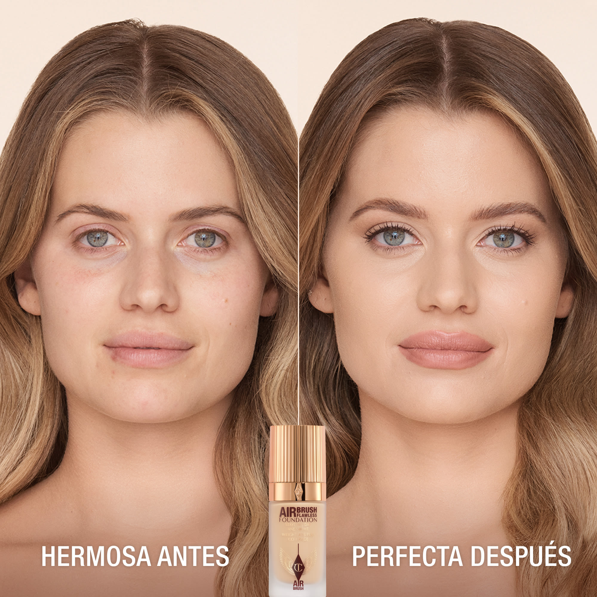 Darling, después de 10 AÑOS CONFIANDO EN AIRBRUSH, he llevado mi base de maquillaje Airbrush Flawless Foundation al SIGUIENTE NIVEL. La ciencia siempre está avanzando y, junto con los mejores laboratorios del mundo, he embotellado la última tecnología para ofrecerte el futuro de la cobertura total.